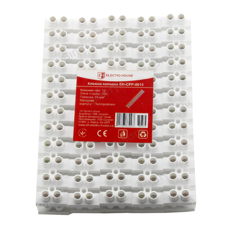 Клемна колодка Поліпропілен 10 A 10 мм² EH-CPP-0013 від компанії Electro House виконує роль швидкого з'єднувача електропроводів з алюмінію і міді між собою. Не маловажною перевагою вважається можливість з'єднання дротів з різних металів без прямого контакту між собою. За конструктивними характеристиками термінал складається з дванадцяти пар електроконтактів з латуні, поміщених в міцну і вогнетривку оболонку з поліпропілену. Кожну з цих пар можна відокремити і використати окремо. Для того, щоб здійснити електроз'єднання, треба струмовивідні жили дротів завести з обох боків в клему і затиснути гвинтами. В умовах експлуатації клемний блок витримує безліч зовнішніх впливів довкілля, таких як підвищені температури, вібраційні навантаження, невеликі механічні дії, ультрафіолетове випромінювання і т. д.