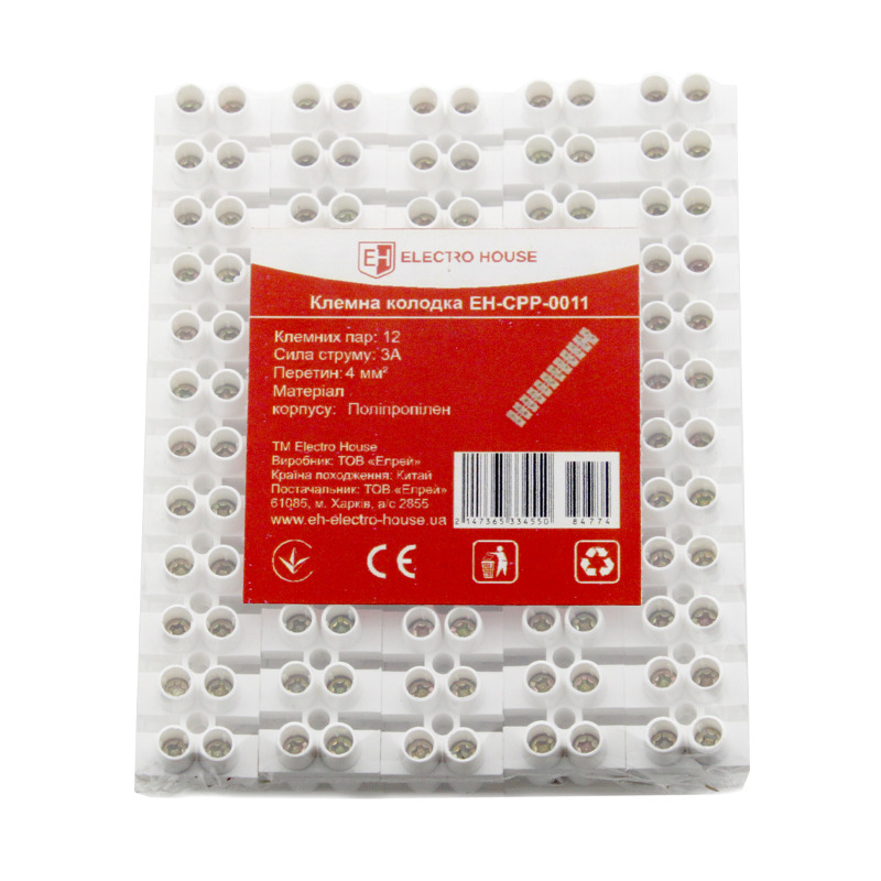 Клемна колодка 3A 4mm2 Поліпропілен EH - CPP - 0011 від торгової марки ElectroHouse підходить для виконання швидкого з'єднання електропроводів з різних металів (алюмінію або міді). Конструкція її складена таким чином: дванадцять пар електроконтактів з латуні знаходяться в міцному, вогнетривкому корпусі з поліпропілену. Кожну контактну пару можна відокремити і використати окремо. Щоб вчинити електроз'єднання треба очищені від ізоляції струмовиводячі жили завести з обох боків в клему і затиснути гвинтами. В умовах експлуатації термінал характеризується зносостійкими властивостями, тому має великий термін служби. Витримує клемний блок безліч впливів довкілля : перепади температур, вібрації, ультрафіолет, дії агресивних речовин (луги, олії, розчинники) і т. д.