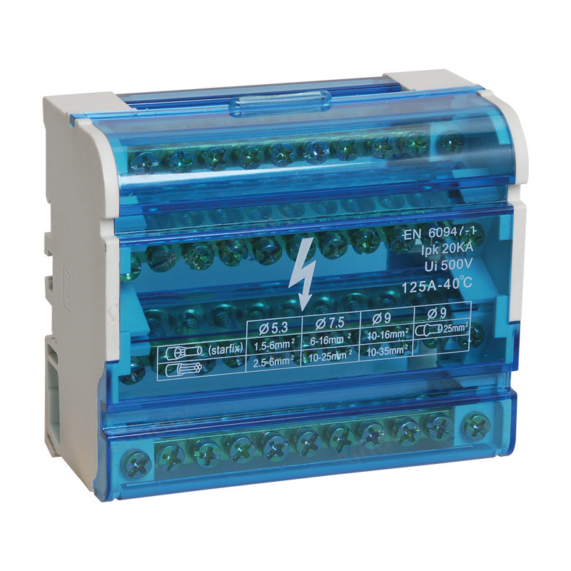 Шина нульова в корпусі (Кросс-модуль 4х11 125 A ) EH-BNS4X11 від компанії "Electro House" призначена для електричного і механічного з'єднання нульових, захисних і фазних провідників. Вона має корпус з термостійкого самозатухаючого пластику в якому розміщені нульові шини ізольовані один від одного перегородками і відкидну кришку з прозорого пластику, яка дозволяє візуально контролювати якість з'єднання дротів, а так само запобігає випадковому попаданню сторонніх предметів. Так само кришка дає захист від випадкового дотику до струмоведучих частин модуля. Крос-модуль має сучасний естетичний вигляд і компактні розміри. Завдяки використанню цього пристрою розводка кабелів в електрощиті або електрошафі стане не лише безпечнішою і компактнішою, але і набуде естетичнішого вигляду. Завдяки наочності розподілу кабелів, яку дає крос-модуль, ремонтні або монтажні роботи займатимуть значно менше часу. Шина нульова в корпусі має кріплення для установки на DIN рейку, що дозволяє її встановити впродовж декількох секунд. Дроти фіксуються в нульовій шині за допомогою гвинтів, що робить з'єднання надійним і дозволяє використати цей пристрій багатократно. Завдяки конструктивним особливостям крос-модуль можна використати і як перехідний клемник для кабелю більшого перерізу якщо необхідно підключити декілька кабелів меншого перерізу, що практично і зручно. Ця модель крос-модуля складається з чотирьох нульових шин, кожна з яких містить по одинадцять кабельних виводів. Діаметр кабельних виводів : 2х 8,5 мм, 2х7, 5 і 7х6 мм мм для кожної шини. Її номінальний струм - 125А. Робоча температура для цього виробу від - 40 до 50оС при середньому значенні відносної вологості не більше 90%. Переріз провідників 2,5 – 16 мм2, що підключаються . Має клас захисту IP20. Для тривалої і надійної експлуатації нульової шини навколишнє повітря не має бути засмічене парами солей, корозійними або запалюючими газами.