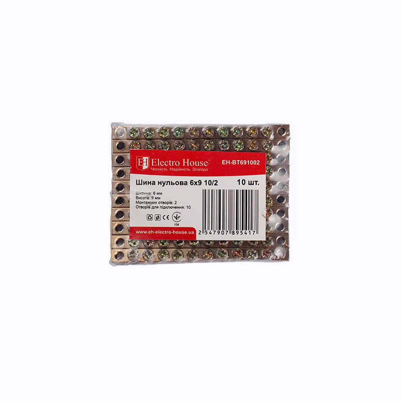 Шина нулевая 6х9 10/2 EH-BT691002 от компании "ElectroHouse" предназначена для электрического и механического соединения нулевых, защитных и фазных проводников. Она имеет два отверстия для установки расположенные по краям шины. Устанавливается на изолятор. Это изделие отличается высоким качеством, надежностью и долговечностью. Соответствует мировым и европейским стандартам качества.На сегодняшний день просто невозможно представить сборку электрощита без применения подобных устройств. Ведь использование этого изделия существенно облегчит работу электриков и сделает ее более безопасной. Если раньше надежная и безотказная работа УЗО обеспечивалась установкой отдельно взятых нулевых шин к каждому отдельно взятому устройству защитного отключения, то теперь можно подвести общий нулевой провод к шине и уже с нее развести от созданного таким образом блока к прочим составным частям созданной системы. Благодаря этому повышается надежность и безопасность всей системы в целом.Конструктивно эта модель представляет собой токопроводящую жилу без изоляции. Токопроводящая жила изготовлена из электротехнической латуни и содержит в себе отверстия с зажимными винтами для крепления в ней проводников (10 кабельных выводов) и имеет длину 78 мм, ширину 6 мм и высоту 9 мм . Диаметр отверстий для монтажа проводников 5 мм.Номинальное напряжение для этой модели - 400В. Номинальный ток - 100А. Рабочая температура для этого изделия от -40 до 50оС при среднем значении относительной влажности не более 90%. Для длительной и надежной эксплуатации окружающий воздух не должен быть засорен парами солей, коррозионными или воспламеняющими газами. Для обеспечения качественного соединения, а также упрощения дальнейшего обслуживания, шина выполнена единым токопроводящим элементом. Ее монтаж прост и не занимает много времени.