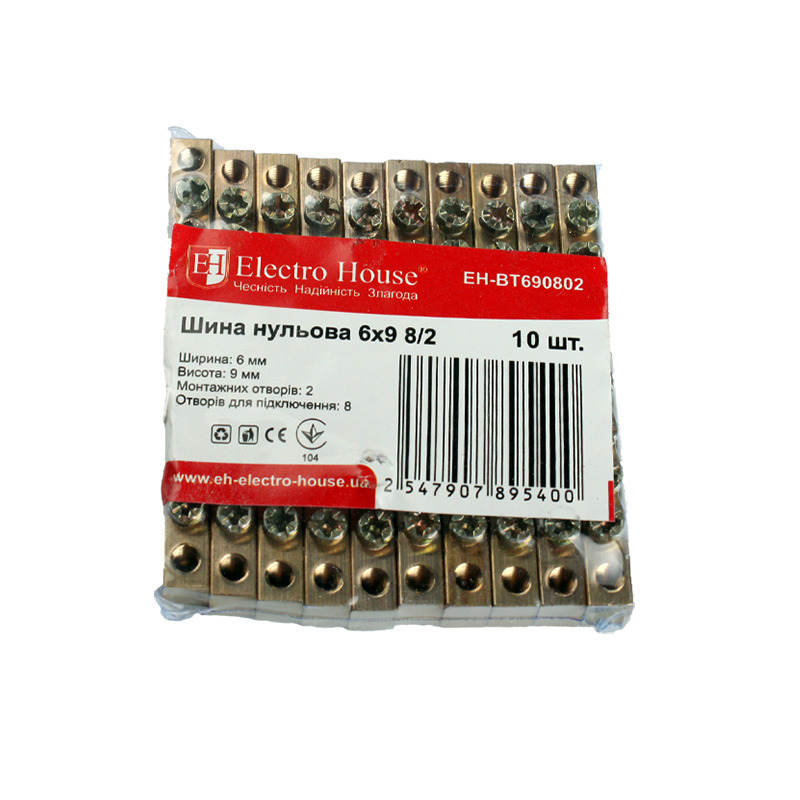 Шина нулевая 6х9 8/2 EH-BT690802 от компании "ElectroHouse" предназначена для электрического и механического соединения нулевых, защитных и фазных проводников. Она имеет два отверстия для установки расположенные по краям шины. Устанавливается на изолятор. Это изделие отличается высоким качеством, надежностью и долговечностью. Соответствует мировым и европейским стандартам качества.На сегодняшний день просто невозможно представить сборку электрощита без применения подобных устройств. Ведь использование этого изделия существенно облегчит работу электриков и сделает ее более безопасной. Если раньше надежная и безотказная работа УЗО обеспечивалась установкой отдельно взятых нулевых шин к каждому отдельно взятому устройству защитного отключения, то теперь можно подвести общий нулевой провод к шине и уже с нее развести от созданного таким образом блока к прочим составным частям созданной системы. Благодаря этому повышается надежность и безопасность всей системы в целом.Конструктивно эта модель представляет собой токопроводящую жилу без изоляции. Токопроводящая жила изготовлена из электротехнической латуни и содержит в себе отверстия с зажимными винтами для крепления в ней проводников (8 кабельных выводов) и имеет длину 66 мм, ширину 6 мм и высоту 9 мм. Диаметр отверстий для монтажа проводников 5 мм.Номинальное напряжение для этой модели - 400В. Номинальный ток - 100А. Рабочая температура для этого изделия от -40 до 50оС при среднем значении относительной влажности не более 90%. Для длительной и надежной эксплуатации окружающий воздух не должен быть засорен парами солей, коррозионными или воспламеняющими газами. Для обеспечения качественного соединения, а также упрощения дальнейшего обслуживания, шина выполнена единым токопроводящим элементом. Ее монтаж прост и не занимает много времени.