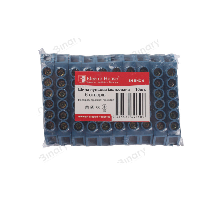 Шина нульова ізольована EH-BNC-6 на шість отворів від компанії "Electro House" призначена для електричного і механічного з'єднання нульових, захисних і фазних провідників. Відрізняється високою якістю, надійністю і довговічністю. Відповідає світовим і європейським стандартам якості. На сьогодні просто неможливо представити збірку електрощита без застосування подібних пристроїв. Конструктивно ця модель є струмопровідною жилою в ізолюючому корпусі з самозатухаючого пластику. Струмопровідна жила виготовлена з електротехнічної латуні і містить в собі отвори із затискними гвинтами для кріплення в ній провідників (шість кабельних виводів діаметром 5,5 мм). Ширина - 11 мм, довжина - 77 мм). Номінальний струм для цієї моделі - 100 А. Робоча температура для цього виробу від - 40 до 50°С при середньому значенні відносної вологості не більше 90. Для тривалої і надійної експлуатації цього виробу навколишнє повітря не має бути засмічене парами солей, корозійними або запалюючими газами. Для забезпечення якісного з'єднання, а також спрощення подальшого обслуговування, шина виконана єдиним струмопровідним елементом. Сам корпус має два отвори для гвинтового кріплення на поверхню. Для правильного функціонування облаштувань диференціального захисту необхідно правильно зробити їх підключення, а в розподільному щиті розділити провідники N від PE. У разі металевого щита, це можна зробити тільки ізолювавши нульовий провідник від корпусу. Завдяки конструктивним особливостям, ця модель підійде для виконання такого завдання якнайкраще - оскільки вона вже ізольована корпусом і не вимагає установки на ізолятор. Її монтаж простий, не займає багато часу і не вимагає додаткового устаткування.